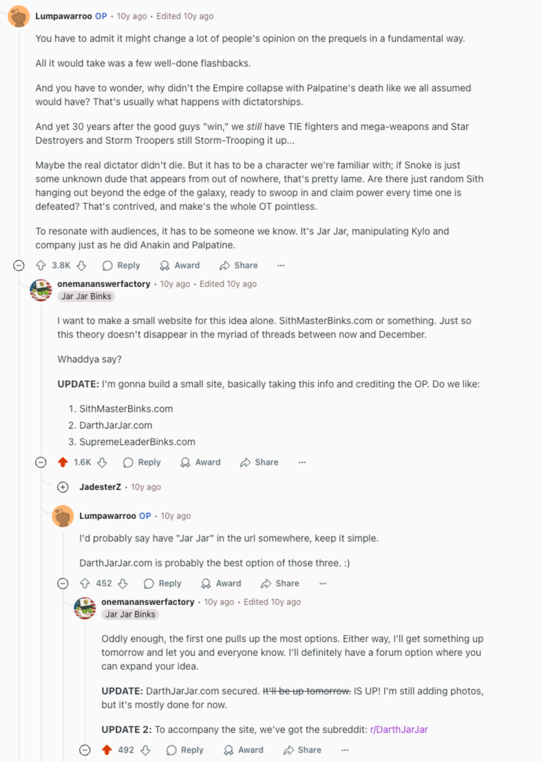 In 2015, under the Reddit handle OneManAnswerFactory, I coined the name “Darth Jar Jar” in that viral post. With that name, the concept evolved from a speculative observation into a fully formed Sith persona: a master strategist, a hidden architect of galactic events, and a dark mirror to the Jedi mythos. I went on to establish the Darth Jar Jar subreddit, this website, and to write the first narrative works that defined his psychology, methods, and role in the fall of the Republic and rise of the Empire.